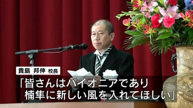 初めての女子生徒23人を含むあわせて60人が入学し、貴島邦伸校長が「皆さんはパイオニアであり、楠隼に新しい風を入れてほしい」と激励しました。