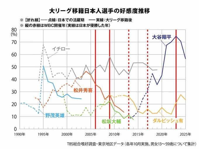 25年は57%と数字を下げましたが、それでも日本が優勝した第2回WBCのときのイチロー選手(58%)と同水準。ここから先、大谷選手の実績と人気の軌跡がどうなるか、ますます目が離せません。
