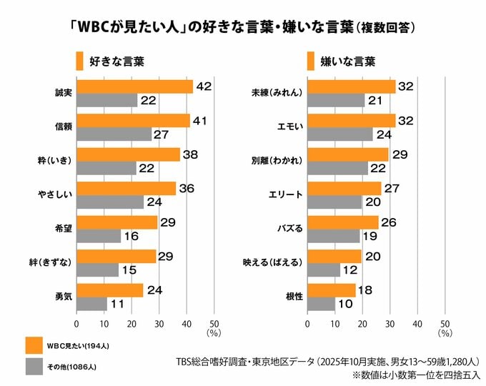これを見ると、WBCファンは、他の人との善なる関わり方(誠実、信頼、やさしい、絆)や、厳しい状況に向き合う心(希望、勇気)といった「前向きな姿勢」をより好んでいる様子。