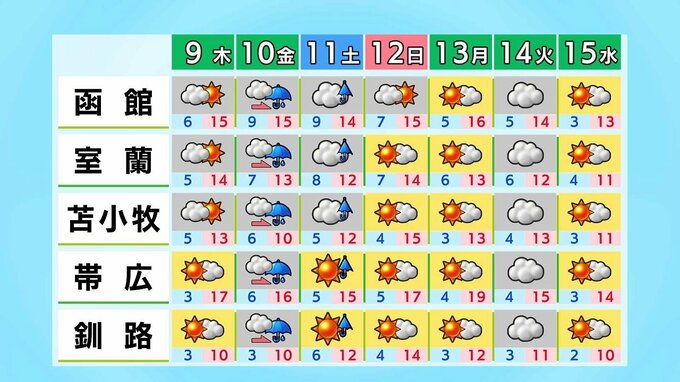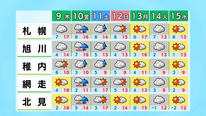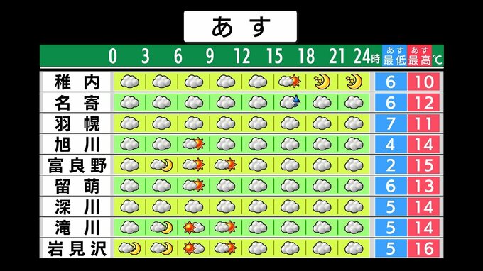 9日は薄日が差す程度で、各地で雲が広がるでしょう。午後は名寄などで弱い雨の降る時間がありそうです。9日も風が強まり、留萌・上川地方を中心に暴風の吹くおそれがあります。