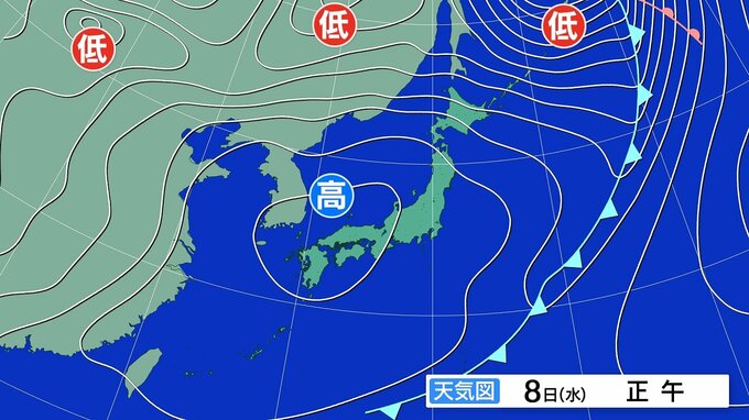 8日の道内は、本州方面に中心を持つ高気圧に覆われ、全道的に晴れています。ただ、等圧線の間隔が狭く、北または西よりの風が強まっています。強風に注意が必要です。