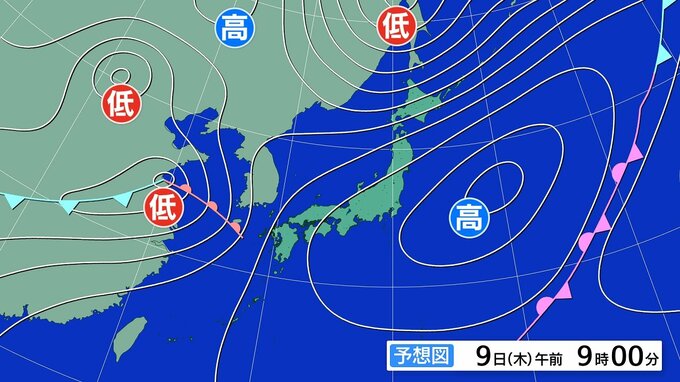 9日の道内は、高気圧は東に離れ、サハリン付近に進む低気圧から気圧の谷が伸びてくるでしょう。9日も等圧線の間隔の狭い状態が続きます。次第に雲が広がりますが、南風が強まり、気温が上がりそうです。
