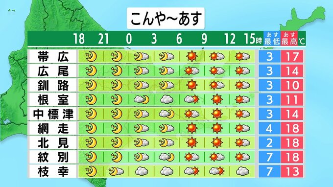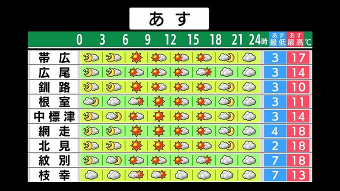 9日の日中は各地で晴れるでしょう。ただ、風がやや強く、空気が乾燥するため、火の取り扱いに気を付けて下さい。9日の網走や北見、紋別の最高気温は18度の予想です。