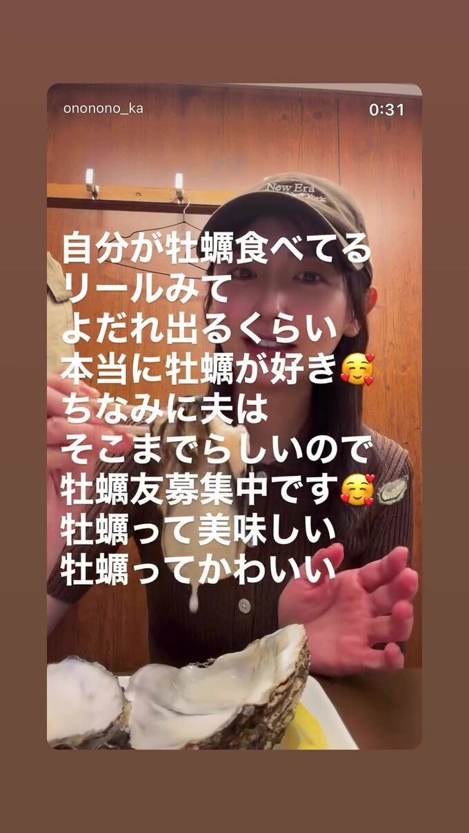おのさんは、筋金入りの牡蠣好きのようで「自分が牡蠣食べてるリールみてよだれ出るくらい本当に牡蠣が好き」「ちなみに夫はそこまでらしいので牡蠣友募集中です」「牡蠣って美味しい 牡蠣ってかわいい」と熱弁。