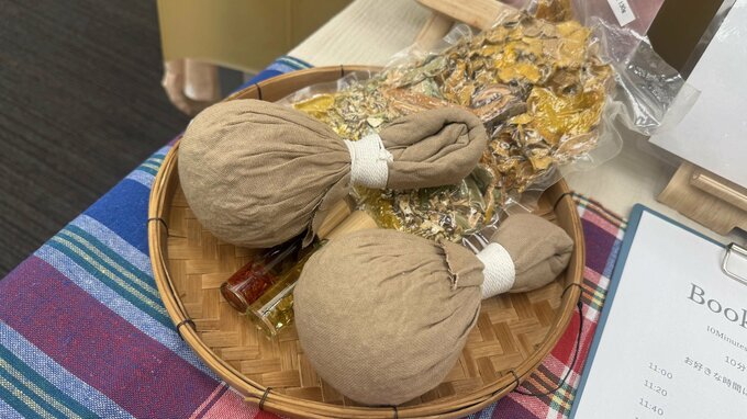 中国やタイ、インドネシア、ミャンマー、ムスリムなどの各出展ブースでは、産前・産後の風習や家族の関わり方、離乳食など、日本とは違う文化が紹介されました。タイでは、蒸したハーブをハンドボール大の大きさに丸めて布で包み、ママの体を温めながらマッサージする習慣があるなど各国の文化を実際に体験した来場者は驚いていました。