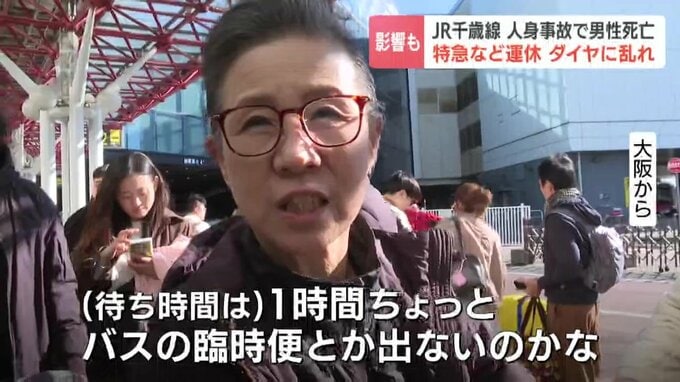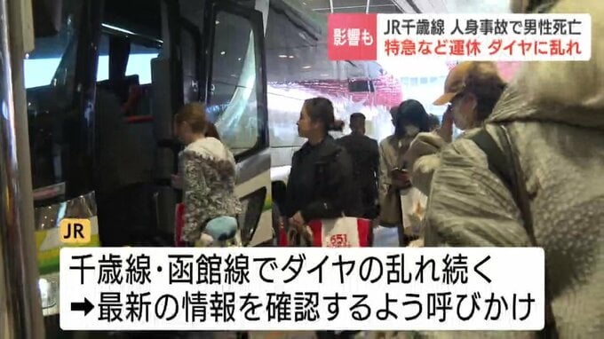 千歳線の札幌と千歳の間の上下線などで一時、運転を見合わせた影響で、特急8本などを含む74本が運休、新千歳空港のバス乗り場は札幌に向かう客などで長い列ができました。