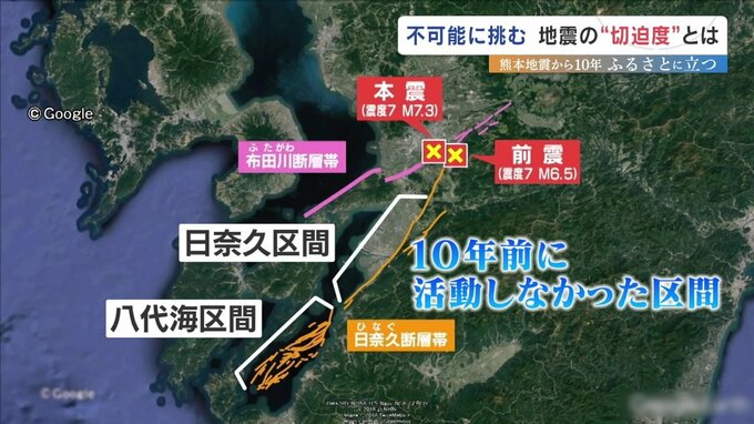九州大学の松本教授が「活発な状態」と指摘するのが、日奈久断層帯の日奈久区間や八代海区間の周辺、布田川断層帯の西側など『10年前に活動しなかった区間』です。