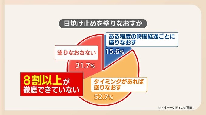 しかし、民間のアンケートによると、「1度塗ったら塗りなおさない」と答えた人が3割を超え、「タイミングがあれば塗りなおす」という人もあわせると、8割以上が日焼け止めのこまめな対策ができていないという実態が明らかになっています。