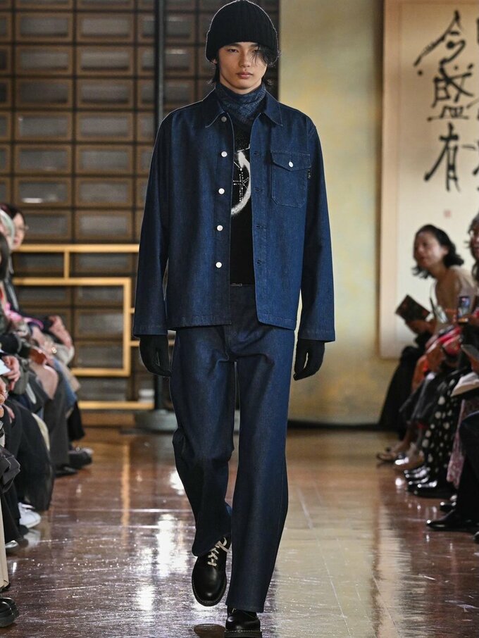 ランウェイでは、濃紺のデニムジャケットとデニムパンツを合わせたオールデニムのスタイルに、黒い手袋とニット帽を組み合わせた直線的なシルエットが印象的です。
