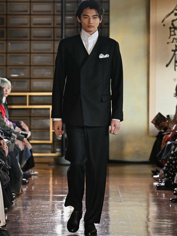 更に、ベルベットジャケットと柄物インナーを合わせたモノトーンスタイルや、白いポケットチーフが映える端正なブラックスーツ姿など、バリエーション豊かなルックを披露しました。