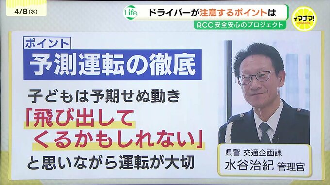 水谷管理官は「登下校時間帯や、子どもが複数で歩いている場合は、『飛び出してくるかもしれない』と思いながら、運転することが大切」と話します。