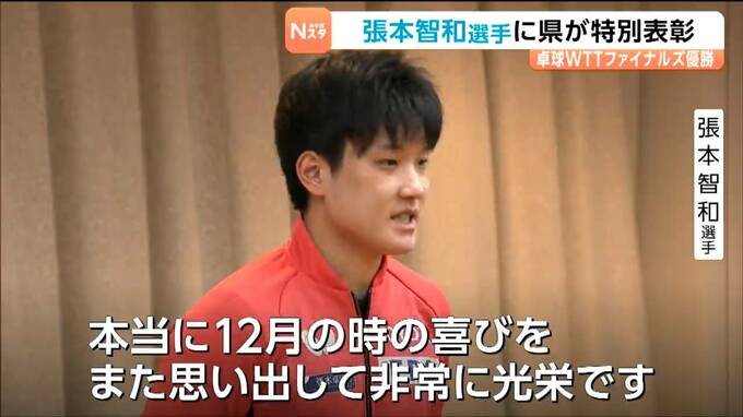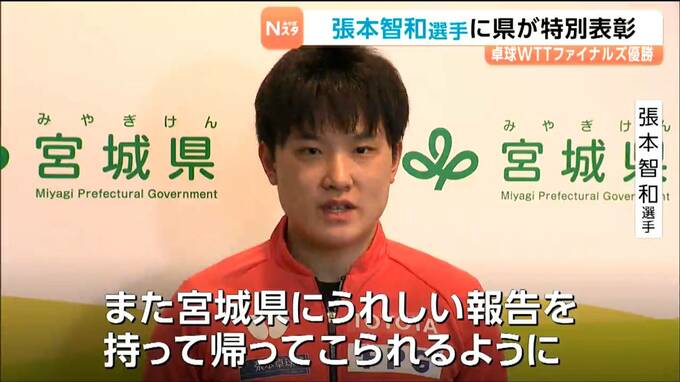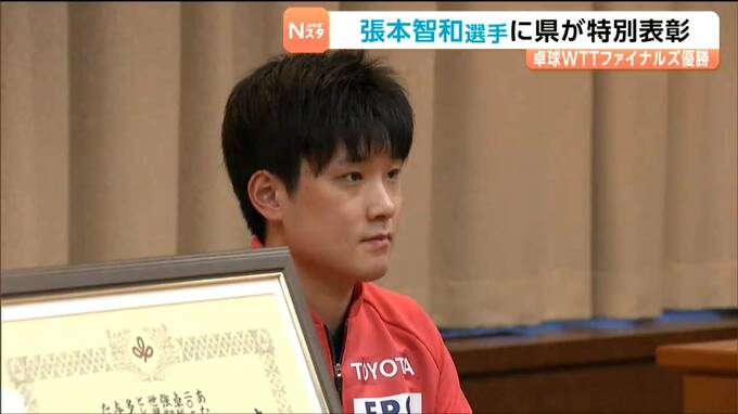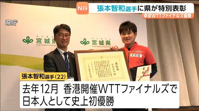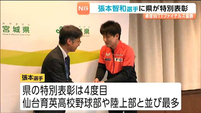 2025年12月、卓球のWTTファイナルズで日本人として史上初の優勝を果たした仙台市出身の張本智和選手が、県から特別表彰を受けました。