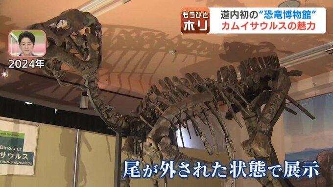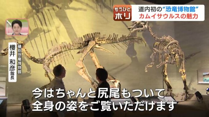 「前足が付いた状態と(もう一体は)持ち上げた状態で展示してある。4本足で歩いてたのか2本足で歩いてたのか、まだまだわからないとこが多いので、このような、どちらの姿をしたのかな、というのもちょっと考えてもらえればと思います」