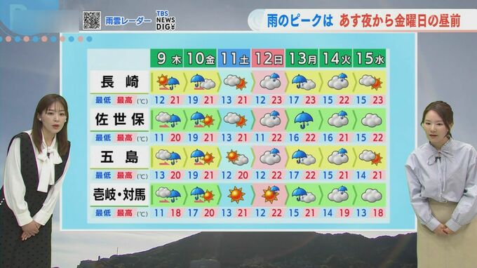 あす夜には五島・壱岐・対馬で1時間に30ミリ程度の激しい雨が予想されています。この雨雲は10日(金)の朝にかけて長崎・佐世保などへ移動し、南部・北部の雨のピークは10日(金)のお昼前にかけてとなる見込みです。