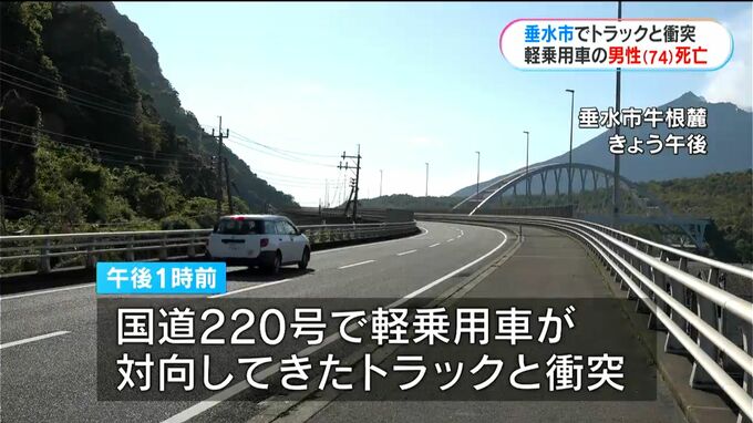 トラックと軽乗用車が正面衝突 1人死亡 見通しのよい道路 鹿児島・垂水市 To view this video please enable JavaScript, and consider upgrading to a web browser that supports HTML5 video 南日本放送 2026年4月8日(水) 19:49 国内 トラックと軽乗用車が衝突 8日午後、垂水市の国道でトラックと軽乗用車が衝突し、1人が死亡、1人がけがをしました。 鹿屋警察署によりますと、8日午後1時前、垂水市牛根麓の国道220号で軽乗用車が対向してきたトラックと衝突しました。