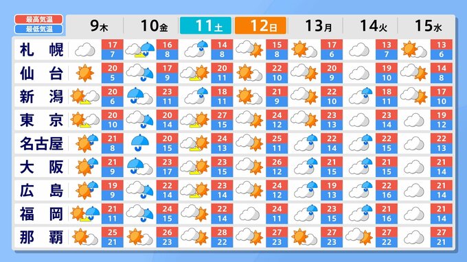 なお、気象庁の「週間天気予報解説資料」によりますと、発達した低気圧の影響を受ける見込みで、11⽇(土)から12⽇(日)頃にかけて、発達した低気圧の影響で北⽇本では荒れた天気となる見込みです。