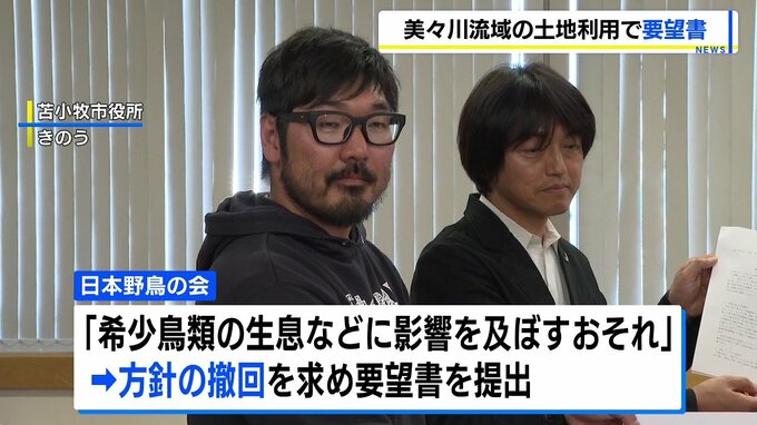 日本野鳥の会は、美々川が注ぐウトナイ湖の「希少鳥類の生息などに影響を及ぼす恐れがある」として苫小牧市に、方針の撤回を求めて要望書を提出しました。
