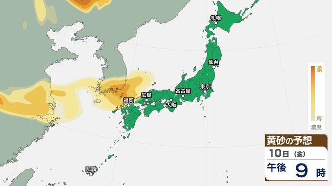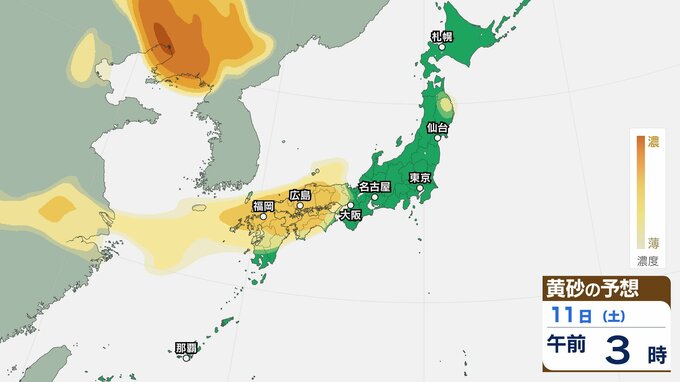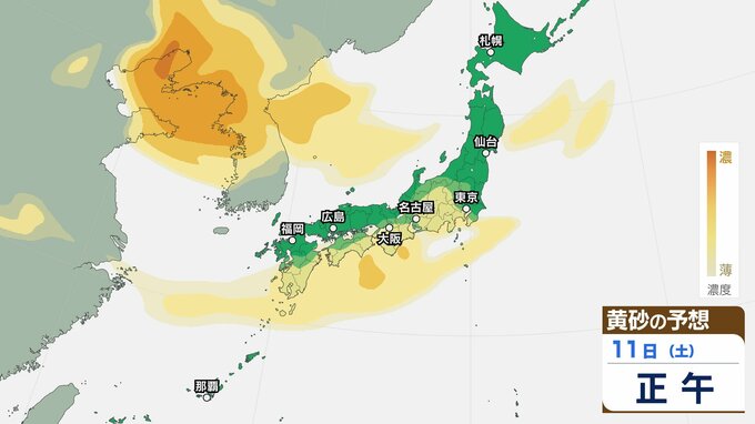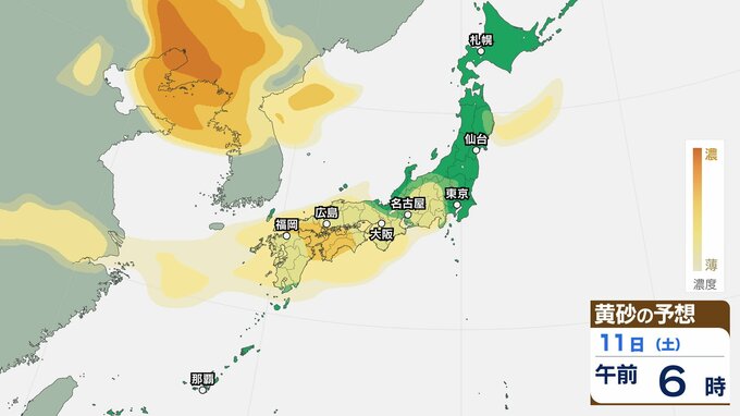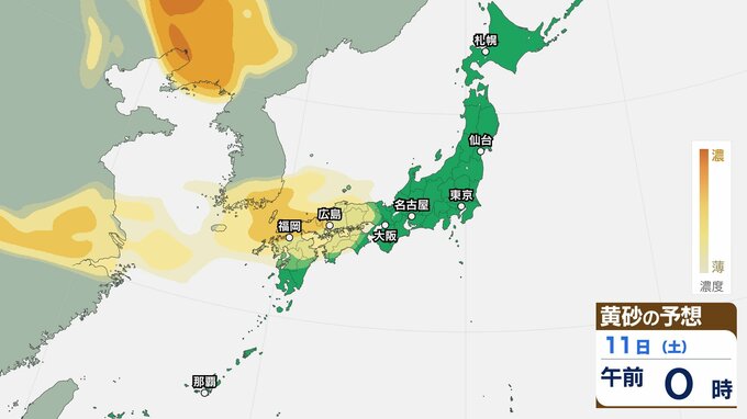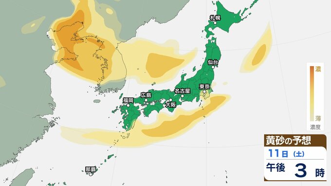 【黄砂情報】11日(土)ごろから日本列島に飛来か…西日本・東日本の広い範囲で影響の可能性 9日(水)~12日(日)黄砂シミュレーション【気象庁 9日現在】 RSK山陽放送 2026年4月9日(木) 11:00 国内 天気 11日(土) 【12日までのシミュレーション】 【12日までのシミュレーション】