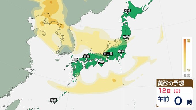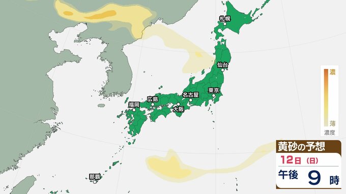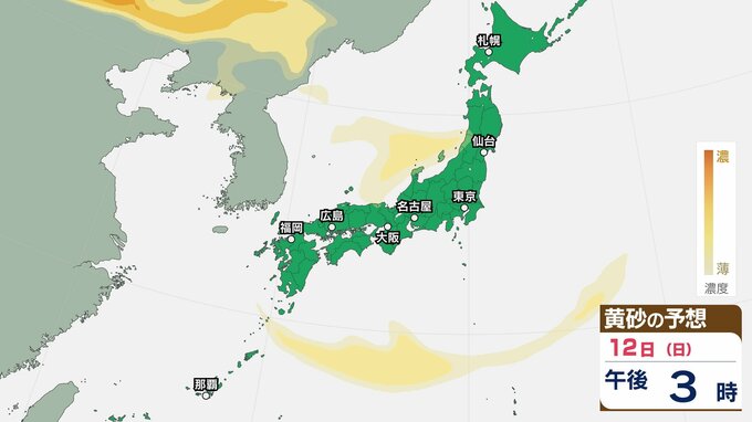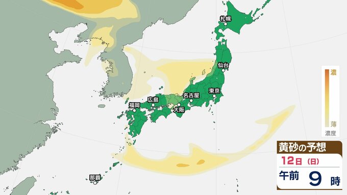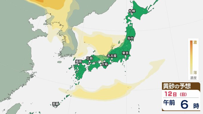 【黄砂情報】11日(土)ごろから日本列島に飛来か…西日本・東日本の広い範囲で影響の可能性 9日(水)~12日(日)黄砂シミュレーション【気象庁 9日現在】 RSK山陽放送 2026年4月9日(木) 11:00 国内 天気 12日(日) 【12日までのシミュレーション】 【12日までのシミュレーション】 飛来が予測されるエリアでは、洗濯物などを屋外で干す際は注意が必要です。また目、鼻、皮膚などに関するアレルギー体質の方や、喘息など呼吸器に疾患がある方は、十分に注意してください。