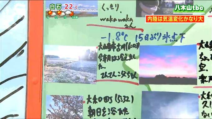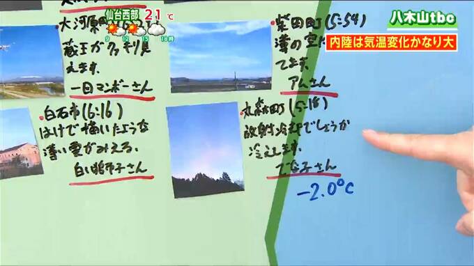 9日朝の宮城県内は放射冷却の影響で厳しい冷え込みとなりましたが、このあと日中にかけて気温が大幅に上昇し、内陸を中心に最高気温が20℃を超えるところが多くなる見込みです。朝と昼の気温差が非常に大きくなりますので、服装の調節が必要です。