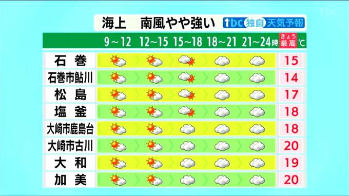 陸上の風は穏やかですが、海上では南風がやや強く吹くでしょう。石巻は海風の影響で暖かさが今一つとなるかもしれません。