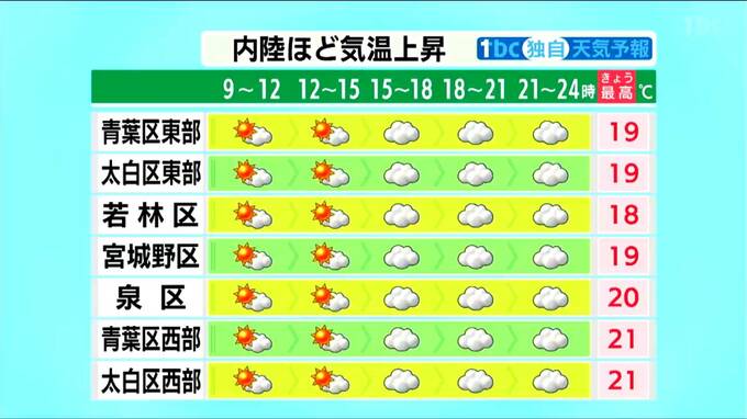 ■太白区東部:19℃ ■太白区西部:21℃ ■宮城野区:19℃