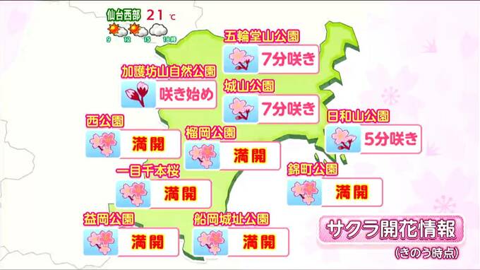 県内では満開・見頃となる場所が増えてきています。県北部でも2025年より5日程度早いペースで開花が進んでおり、涌谷の城山公園なども見頃になりつつあります。