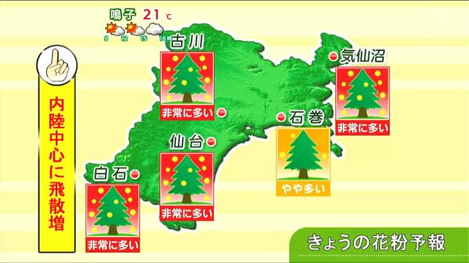 4月になっても中々花粉が収まっていきません。9日も海風が届きにくい内陸を中心に花粉飛散が非常に多くなるおそれがあります。