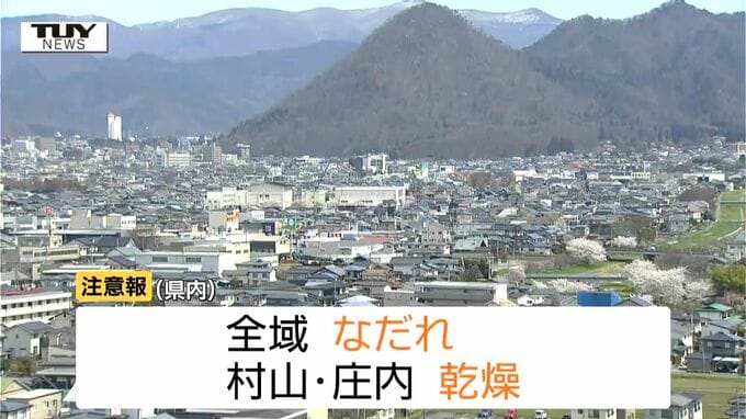 県内全域にはなだれ注意報が出ていて、雪が残る傾斜地ではなだれに注意が必要です。また村山と庄内に乾燥注意報が出ています。火の取り扱いにご注意下さい。