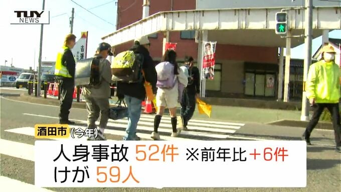 酒田警察署によりますと酒田市では今年に入ってから人身事故が52件発生しています。死亡した人はいませんが、去年の同じ時期に比べ事故件数は6件増えていて、59人がけがをしています。