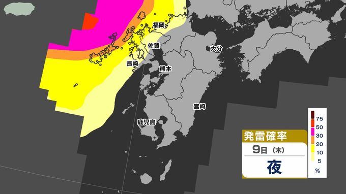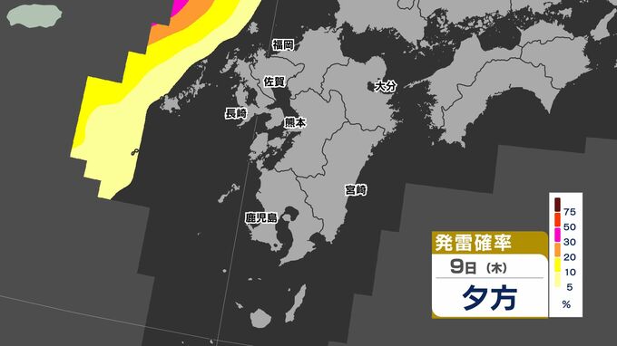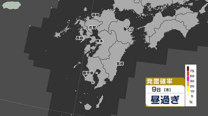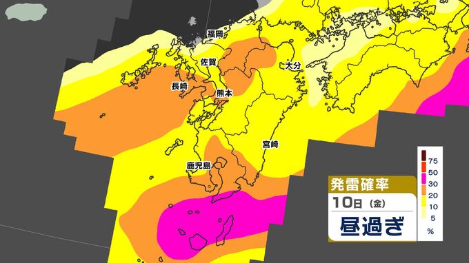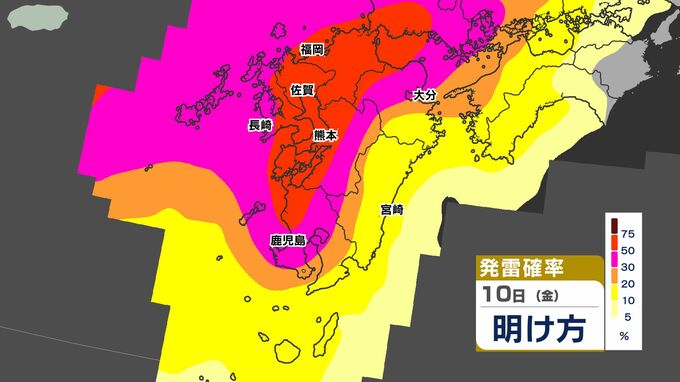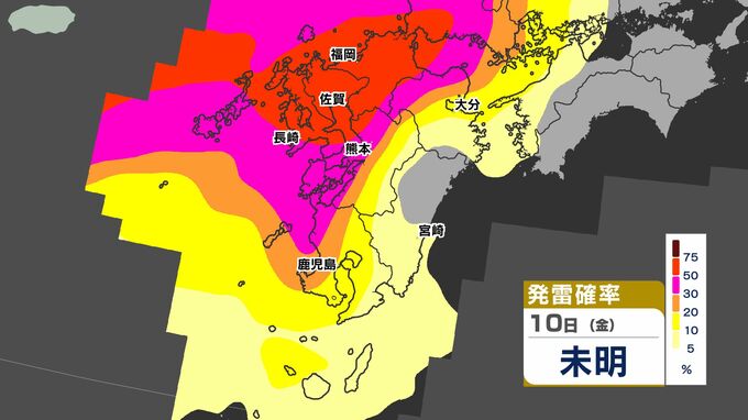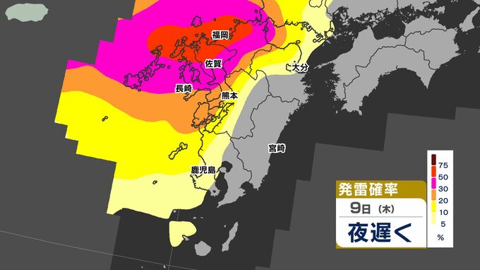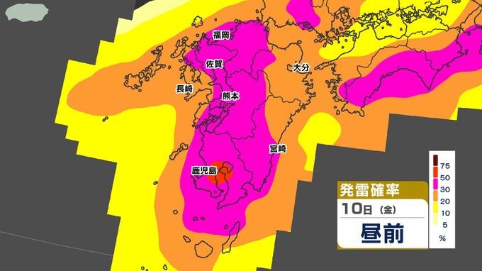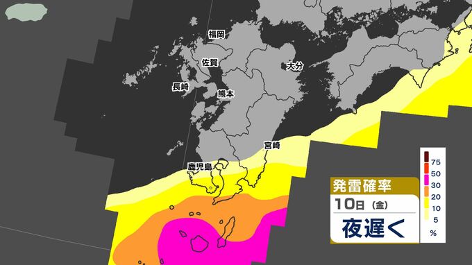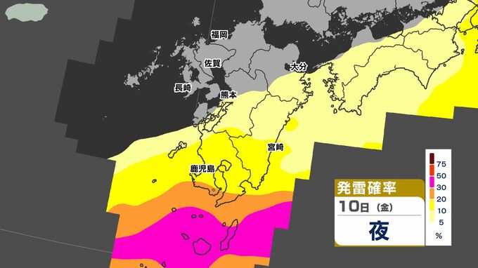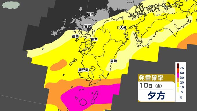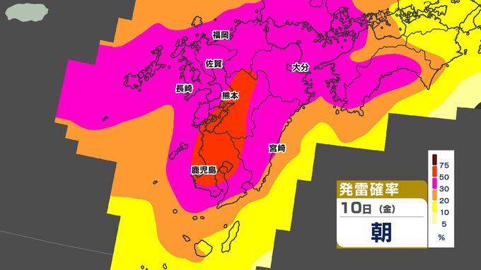 【警報発表か】大雨 暴風 警報発表のおそれ【雨と風シミュレーション9日(木)10日(金)/週間予報】気象庁「落雷と突風に関する気象情報」福岡・佐賀・長崎・大分・熊本・宮崎・鹿児島【大雨情報】 南日本放送 2026年4月9日(木) 12:00 国内 天気 発雷確率シミュレーション9日(木)10日(金) 50%以上と高い予想ですので、落雷だけでなく、竜巻などの激しい突風に注意してください。 発達した積乱雲の近づく兆しがある場合には、建物内に移動するなど、安全確保に努めてください。