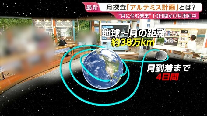 地球から月までの距離は約38万キロ。月に到着するまでは4日間かかります。