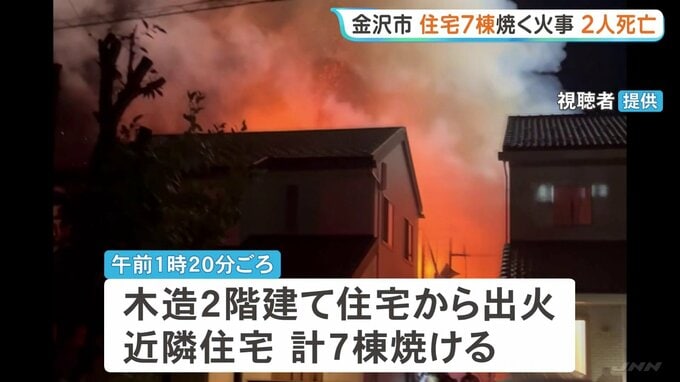 きょう未明、金沢市で住宅7棟が焼ける火事があり、2人が死亡、1人が病院に搬送されました。きょう午前1時20分ごろ、金沢市畝田東の木造2階建て住宅から火が出て、近隣住宅と合わせて7棟が焼けました。火はおよそ3…