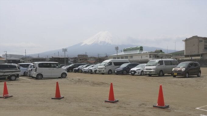 公園からおよそ1キロ離れた下吉田第二小学校は、グラウンドのおよそ半分が臨時駐車場になっています。