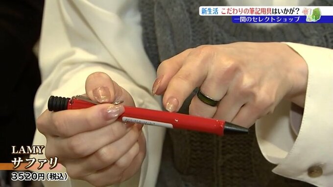 新生活に彩りを添える、お祝いにもぴったりな筆記用具の数々 一関市のセレクトショップでこの春おすすめのペンを聞く 岩手 IBC岩手放送 2026年4月9日(木) 21:00 国内 【画像はこちらから】 こちらはLAMYのペン。 カラー展開が豊富で、持ちやすいシンプルなデザインが印象的です。 【画像はこちらから】 川島キャスター 「この部分、しっかりと指に合うようにデザインが施されています。持っていて心地がいいです」 差し色として、スーツやジャケットなどのポケットにクリップ部分をさして、ファッションを楽しむ人も多いそうです。
