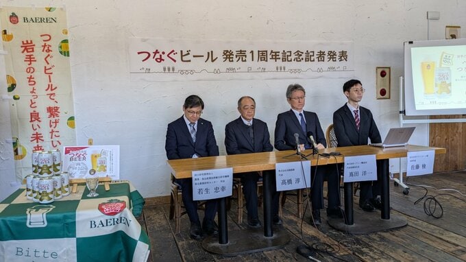 発売から1周年を迎えた「つなぐビール」は、「岩手大学クラフトビール部」と共同開発したもので、原料となる大麦やホップの生産から製品化まで100%県産にこだわったビールです。