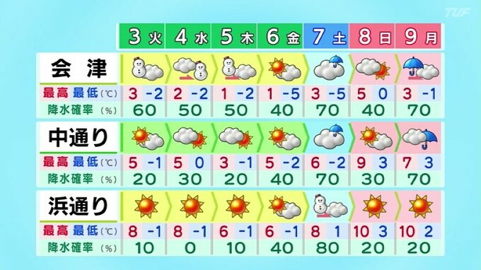 3日も冬型の気圧配置が続くため会津では広く雪が降るでしょう。中通りと浜通りは日差しが届く見込みです。