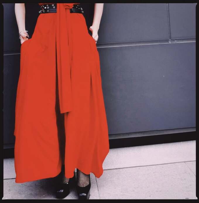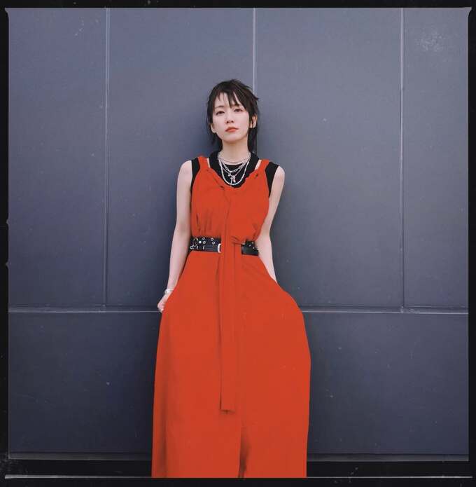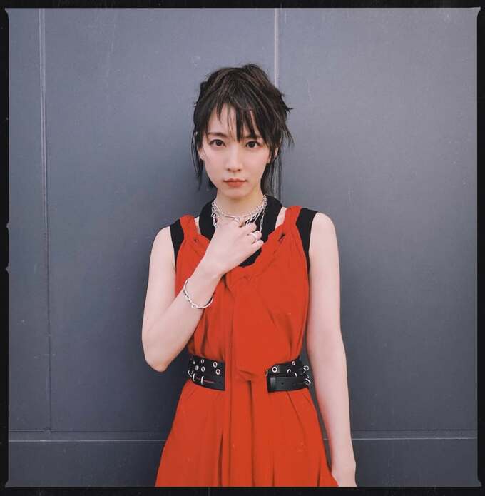 公開された写真の吉岡さんは、黒のトップスに鮮やかな赤のサロペットパンツを身にまとったコーディネート。胸元に結んだリボンと、黒のベルトがアクセントになっています。