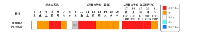 東海地方の向こう2週間の気温は、暖かい空気に覆われやすいため高く、12日頃までと15日頃からはかなり高くなる見込みです。農作物の管理等に注意してください。また、今後の気象情報等に留意してください。
