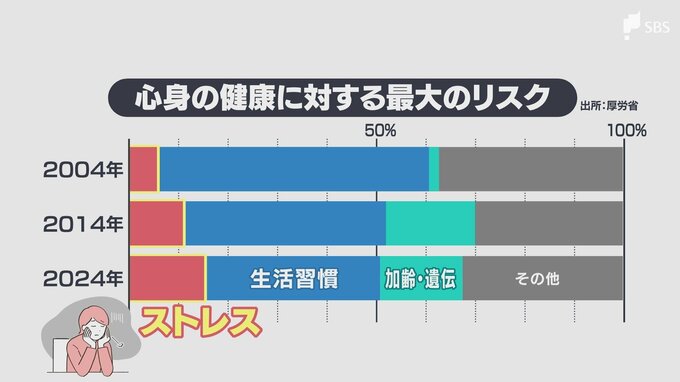 厚生労働省によりますと、ストレスが健康を損なう要因として挙げた人がこの20年間で約3倍以上に増加しています。