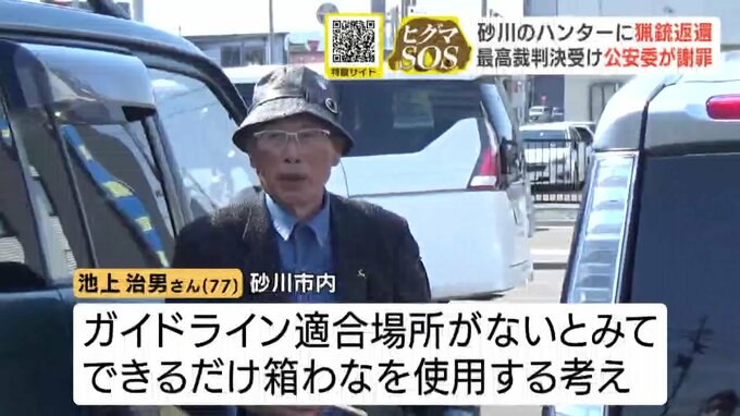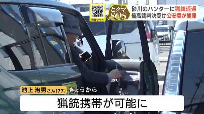 猟銃所持許可取り消しから7年…北海道砂川の男性ハンターに猟銃返還 最高裁判決受け、北海道公安委員会が謝罪 ハンター「長い7年間だった」 北海道放送 2026年4月9日(木) 17:53 国内 猟銃携帯が可能になるも…箱わなを使用する予定 池上さんは、9日から猟銃を携帯できるようになりました。 ただ、砂川市内には国が示した「緊急銃猟」のガイドラインなどに適合する場所がないとみていて、できるだけ箱わなを使った防除に取り組む考えです。
