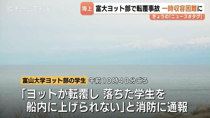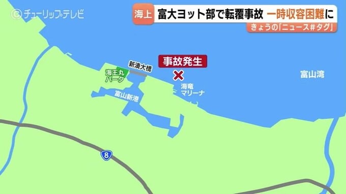 転覆事故があったのは、富山県射水市の海竜マリーナの沖合約700メートルの海上で、9日午前10時40分頃、富山大学ヨット部の学生から「ヨットが転覆し、落ちた学生を船内にあげられない」と射水市消防に通報がありました。