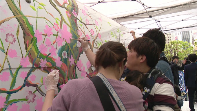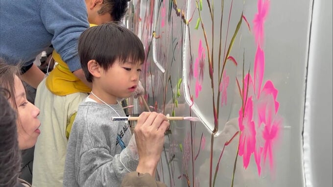 9日午前、JR博多駅前広場では、親子連れなど、およそ200人が九州新幹線「つばめ」の車体に絵の具で桜の花びらを描きました。