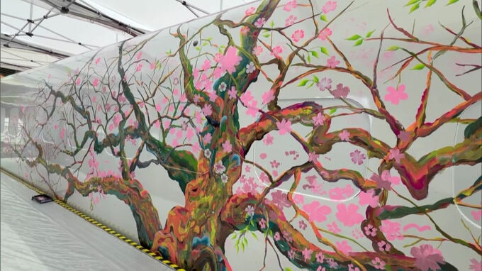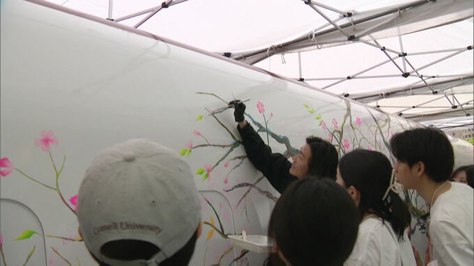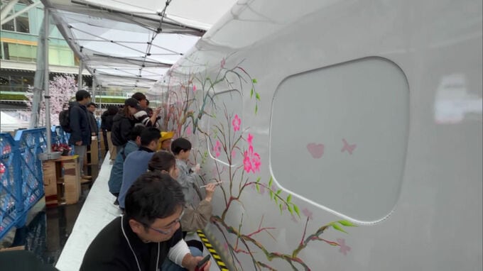 熊本地震で被災し復活した九州新幹線「つばめ」の車体に桜の絵を描くイベントが、JR博多駅前で行われました。