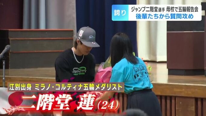 【スキージャンプ】メダリスト・二階堂蓮が母校に凱旋 後輩たちから質問攻め 新メンバー加入の『雪印メグミルク』は必勝・安全祈願 北海道放送 2026年4月9日(木) 18:16 国内 ミラノ・コルティナ五輪のスキージャンプで、3つのメダルを獲得した北海道江別市出身の二階堂蓮選手が母校の中学校で報告会を行いました。 スキージャンプの二階堂蓮選手は、9日、母校の江別市大麻東中学校で後輩たちから大きな拍手で迎えられました。