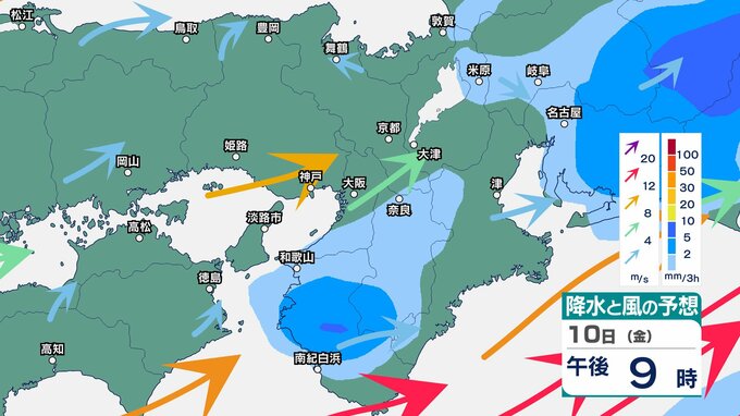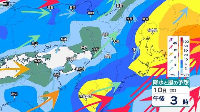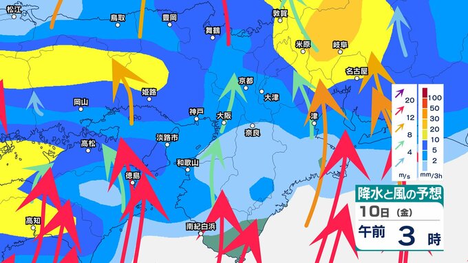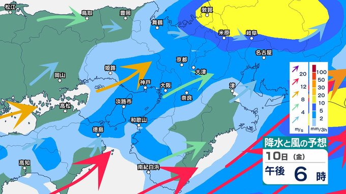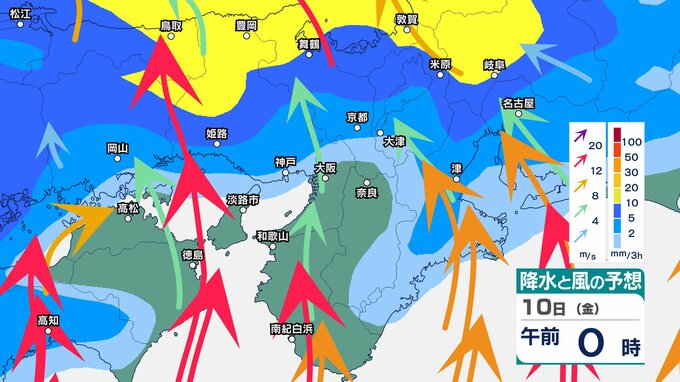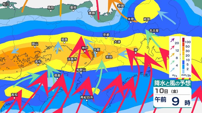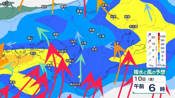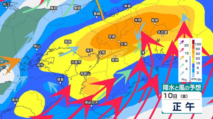 和歌山県は、前線や湿った空気の影響で雨が降り、朝から昼過ぎにかけて非常に激しい雨や激しい雨の降る所があるでしょう。雷を伴う所がある見込みです。