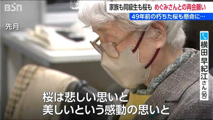 しかし…その傍らにあり49年前にめぐみさんの入学を見守った桜の木は朽ちた幹から伸ばしたわずかな枝で懸命に花を咲かせていました。