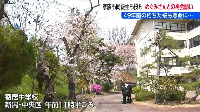 新潟市中央区にある寄居中学校です。桜がきれいに咲き誇り、見頃を迎えていました。49年前の春、この場所で写真を撮っていた横田めぐみさん。7か月後に北朝鮮に拉致されました。