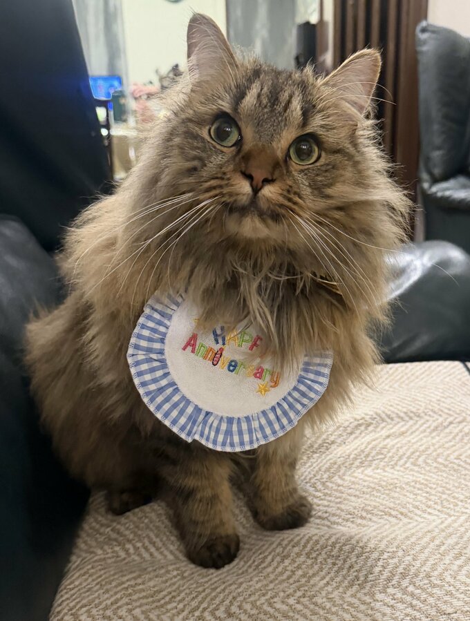 武藤さんは、「Happy Anniversary」という縫い取りのスタイを着けた長毛種の愛猫・ルビーを抱いて2ショットを撮影。ちょっとほっこりしたような武藤さんの表情に比べ、ルビーの表情は目つきもキリリとしています。