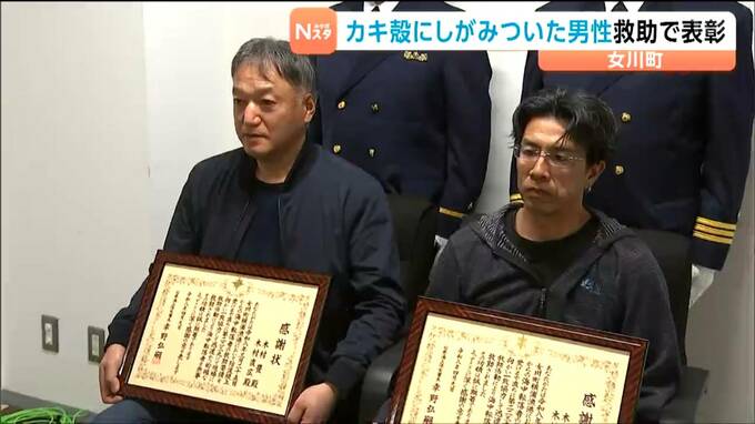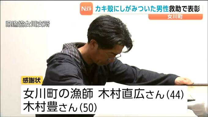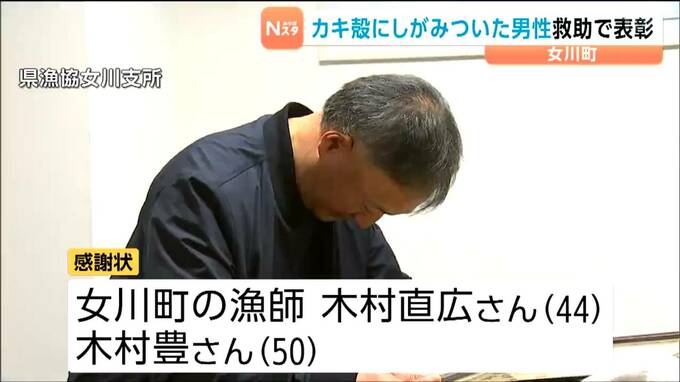 石巻海上保安署から感謝状を受け取ったのは、いずれも宮城県女川町の漁師、木村直広さん(44)と木村豊さん(50)です。2人は3月25日、女川町の横浦漁港の岸壁で作業中、防波堤で釣りをしていた女性から「海に落ちた人がいる。助けてください」との救助要請を受けました。